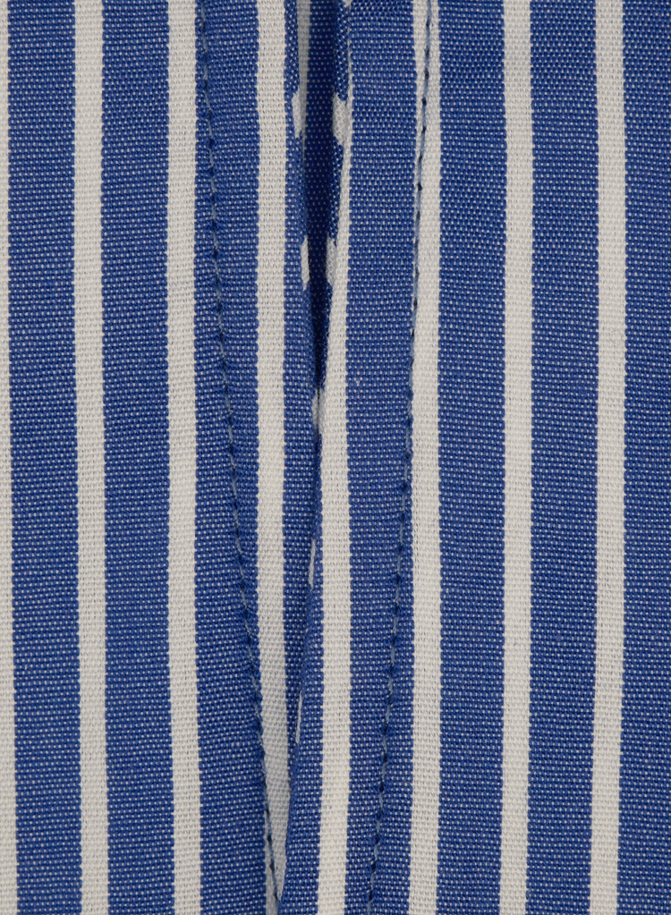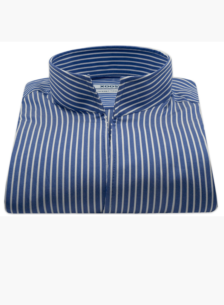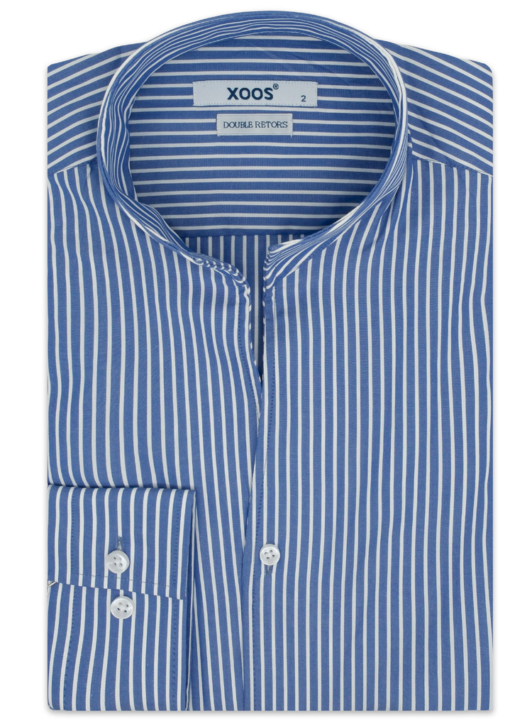 • Striped navy blue dress shirt. • Fitted cut• Staight V shape Open collar• Single cuffs• Double Twisted cotton• Essential piece of men's wardrobe• Formal dress code.