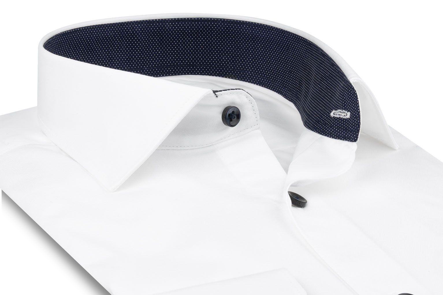 • White dress shirt. • Fitted cut• Cutaway collar• Single cuffs• Printed and polka dots lining• Matching buttons threads• Double Twisted cotton• Business casual dress code.