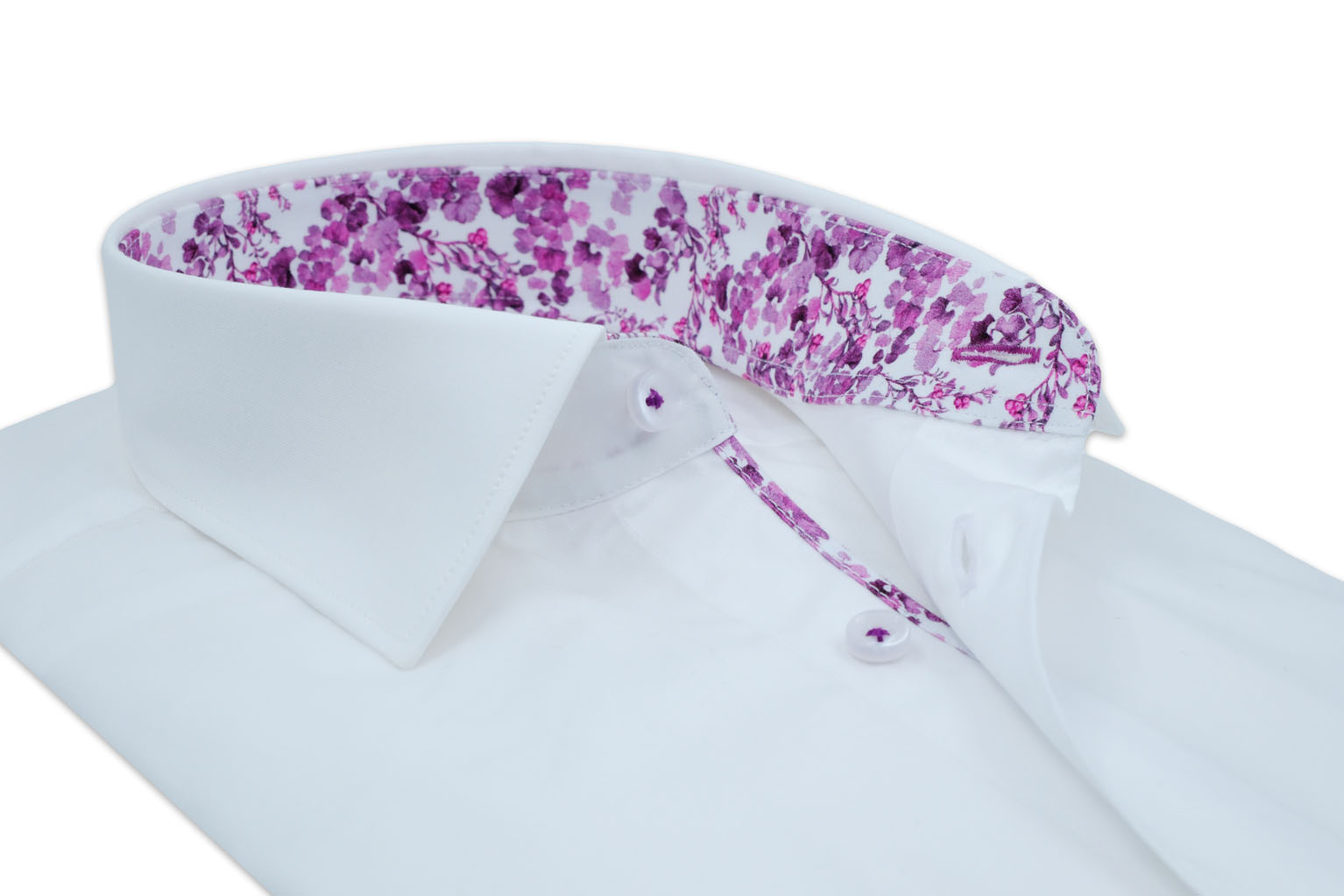 • Chemise homme en tartan gris • Coupe ajustée ou cintrée • Col Français • Poignets simples • Pur coton •Doublure noire à micro pois •Galon de col mauve • Look casual