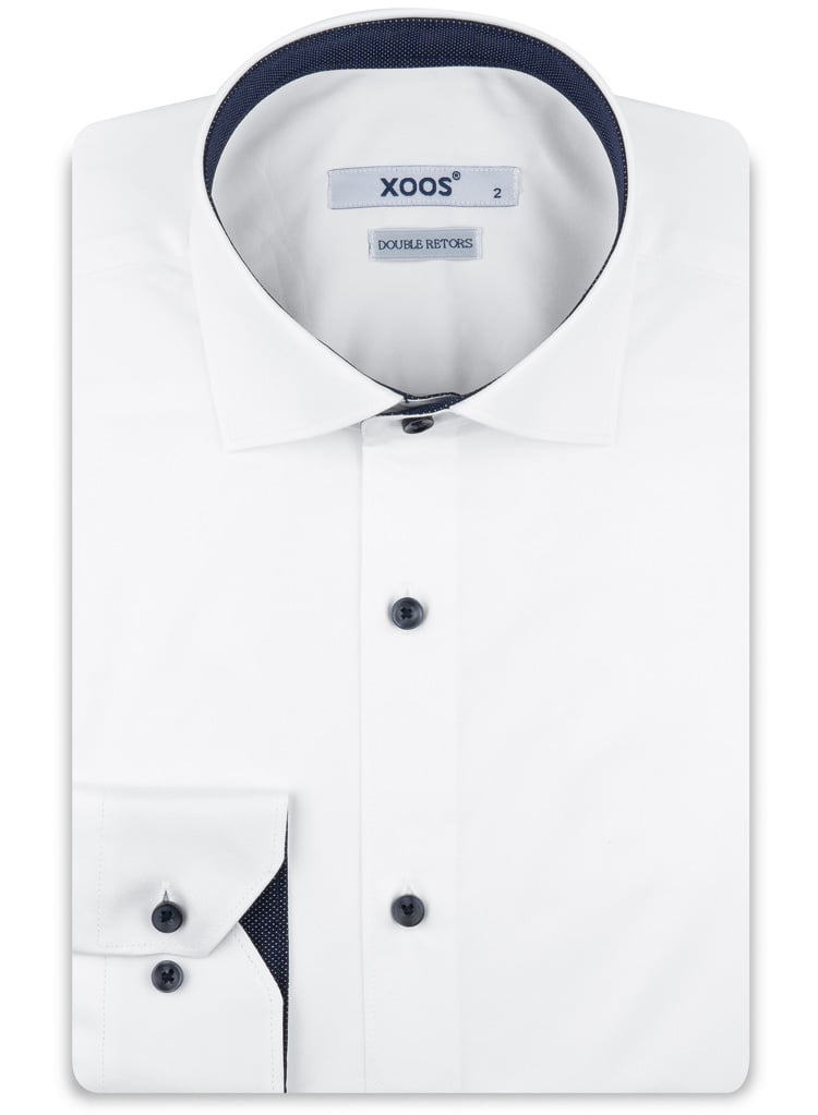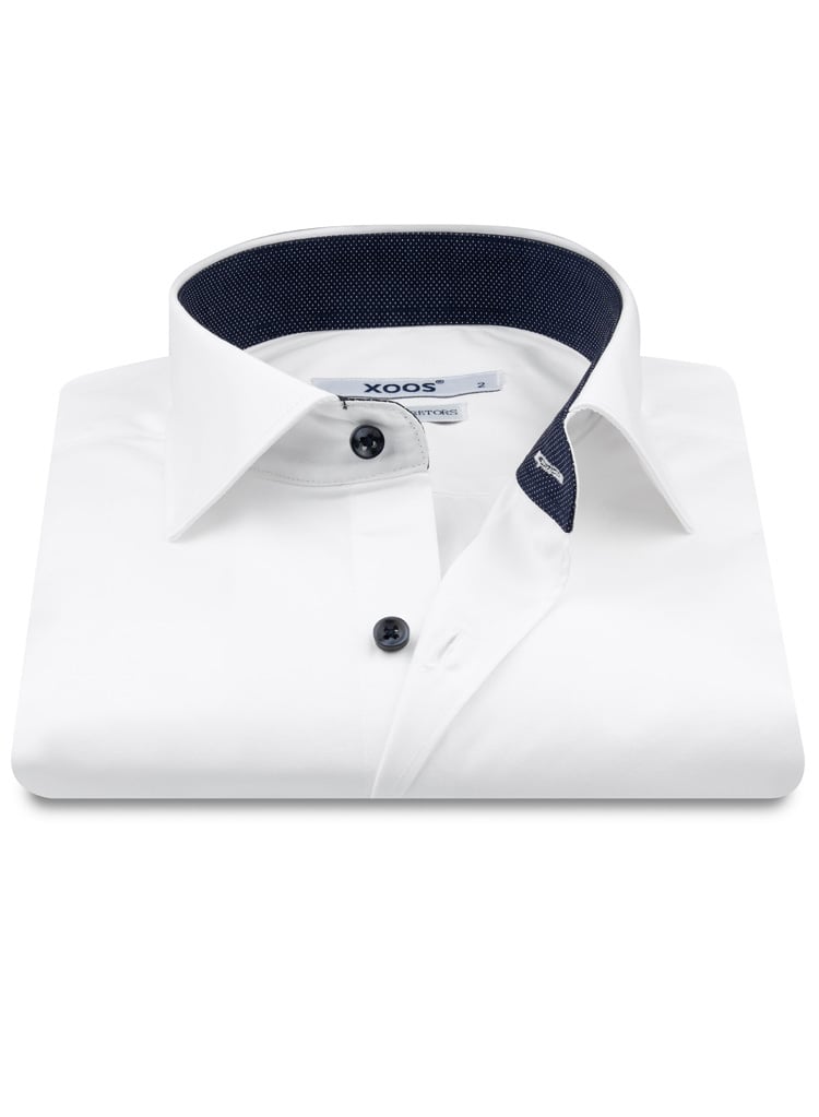 • Chemise homme blanche. • Coupe ajustée ou cintrée • Col Italien • Doublure imprimée et à micro pois • Boutonnière assortie • Poignets simples • Pur coton Double Retors • Look business casual