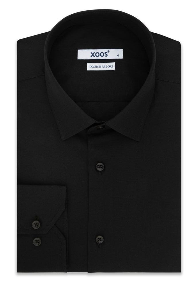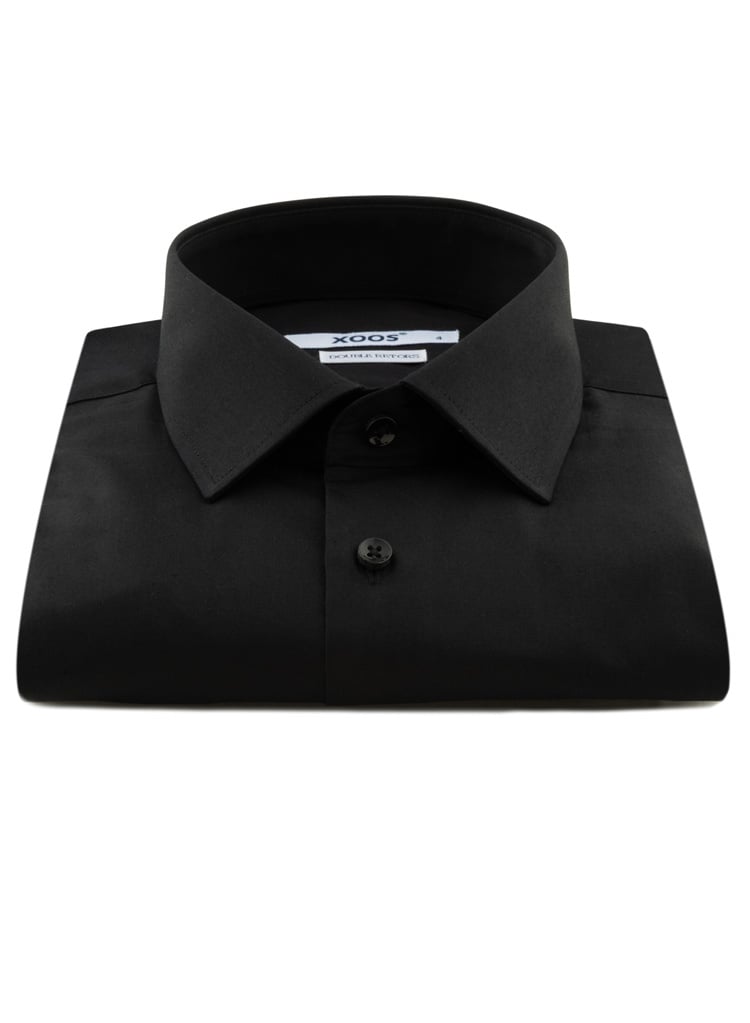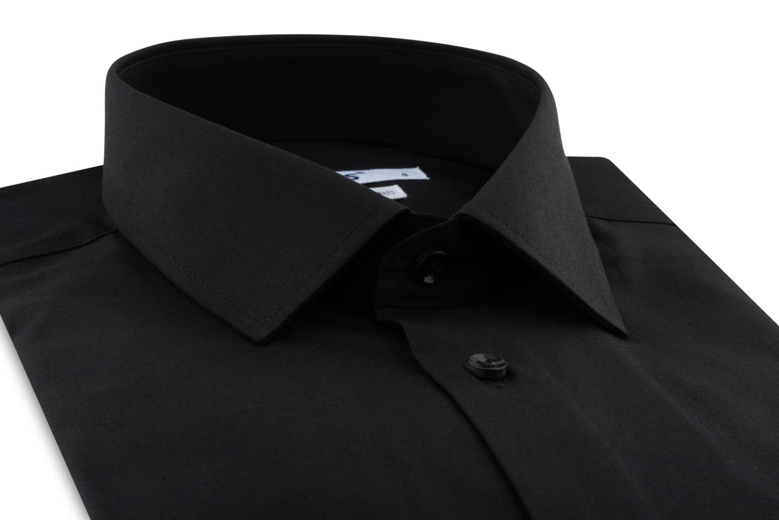 • Chemise homme noire • Coupe ajustée ou cintrée • Col Français • Poignets simples • Popeline de coton Double Retors • Indispensable du vestiaire masculin • Look intemporel