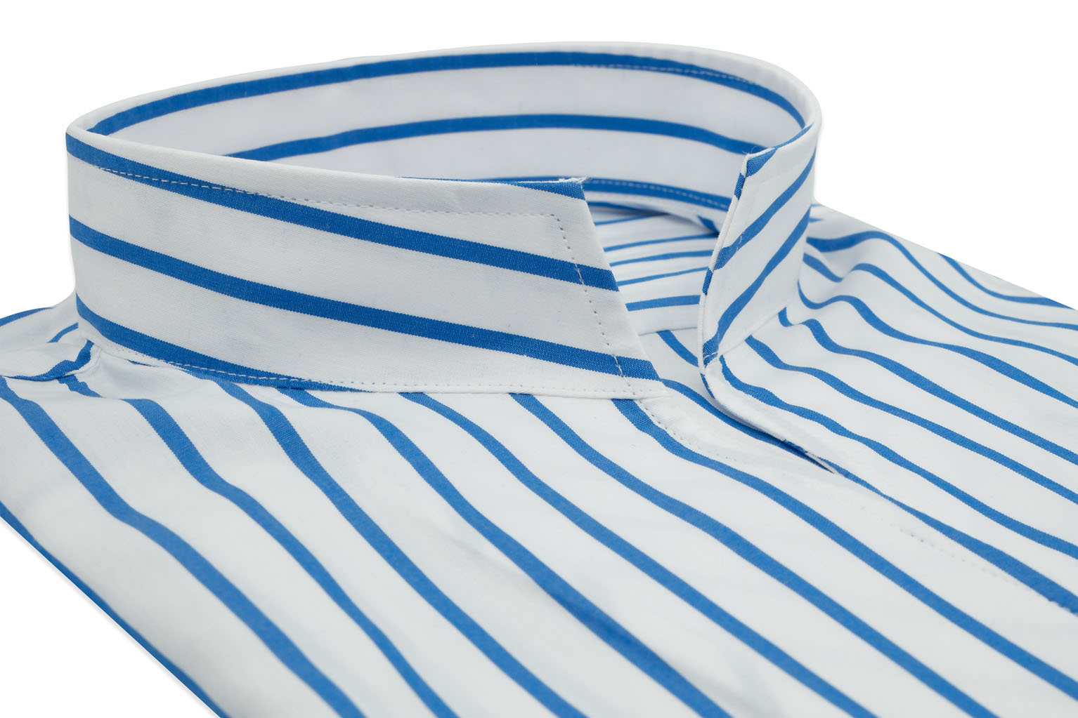 Chemisier femme blanc à rayures bleues et col droit ouvert